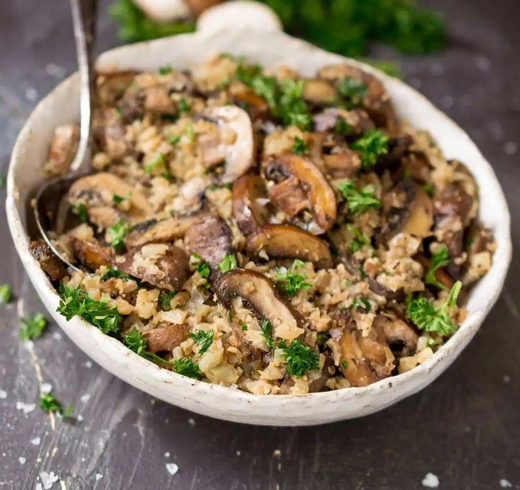 cremini mushrooms, garlic, black pepper, salt, soy sauce, cauliflower, onion, fresh parsley