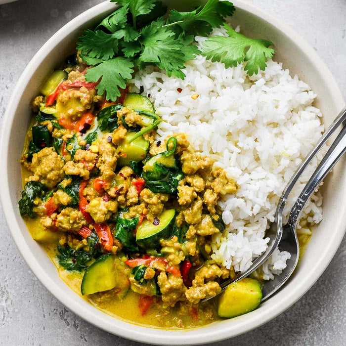 olive oil, shallots, garlic, ginger, curry powder, salt, bell pepper, ground turkey, coconut milk, tamari, soy sauce, cornstarch, zucchini, lime, spinach, red pepper flakes, rice of your choice