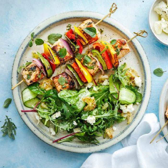 salmon, onion, bell pepper, arugula, feta cheese, garlic, lemon, black pepper, apple vinegar, cucumber, cilantro