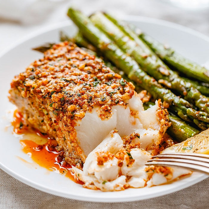 cod, asparagus, parmesan, paprika, sea salt, black pepper, garlic, olive oil, parsley, lemon