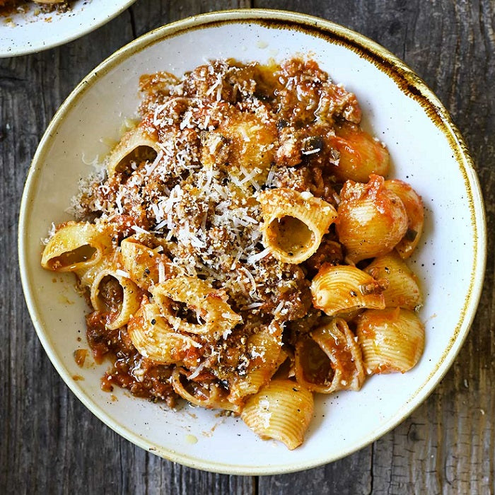 ground beef, eggplant, onion, garlic, olive oil, celery, carrot, tomato sauce, cumin, Parmesan, black pepper, pasta