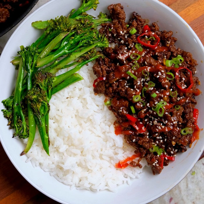 ground beef, sriracha, coco amino, rice wine vinegar, avocado oil, onion, garlic, ginger, red chili, sesame seeds, onion, rice, broccoli