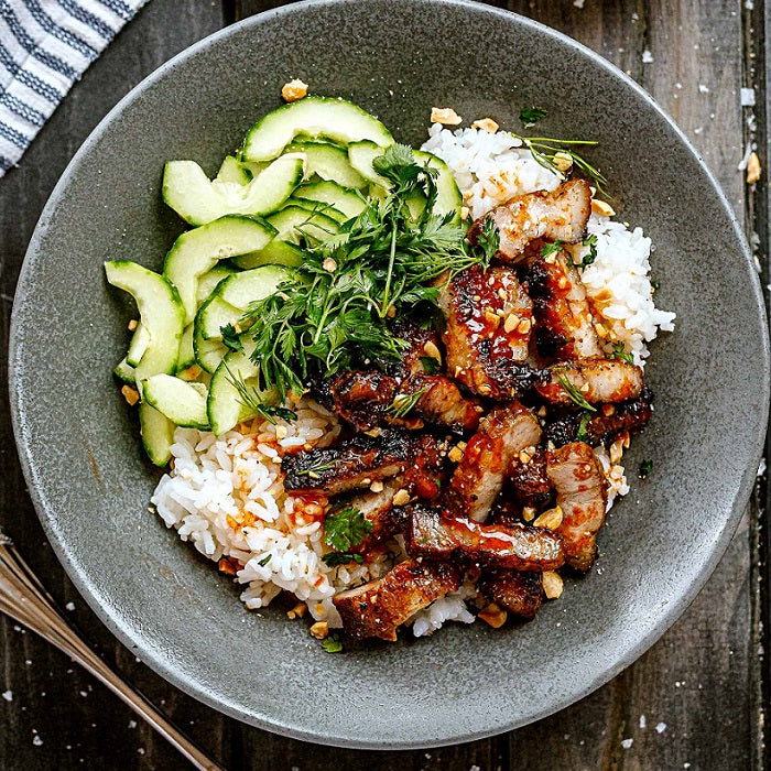 pork, garlic, ginger, brown sugar, coriander seeds, fennel seeds, soy sauce, white vinegar, avocado oil, Sriracha, cucumber, cilantro, dill, Whole30 mayo, rice of your choice