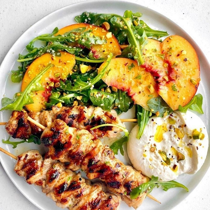 Peach and Chicken Skewers Salad with Burrata