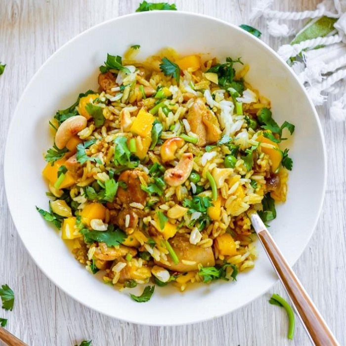 chicken, mango, coconut milk, garlic, ginger, chili powder, cilantro, cashew, salt, olive oil, red onion, green peas, brown rice