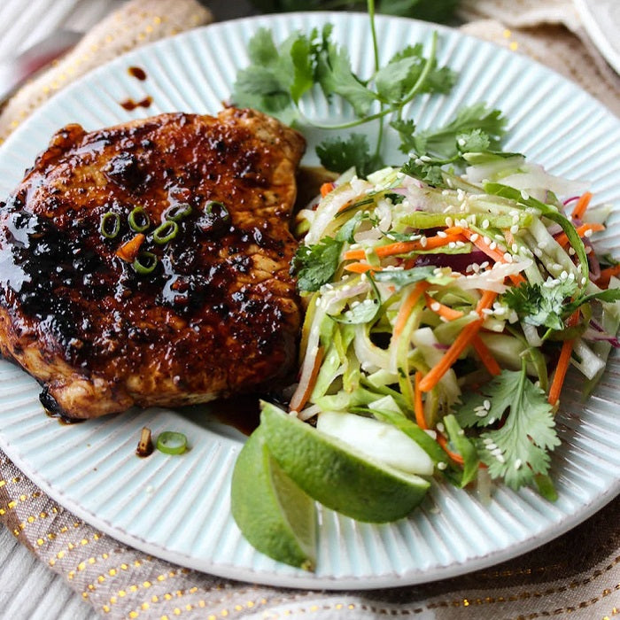 pork chops, cabbage, pear, carrot, red onion, radish, cilantro, rice wine vinegar, brown rice, vegetable oil, lime, salt, pepper, sesame seeds, garlic, lower sodium soy sauce, honey, ginger, mirin, Sriracha, green onion