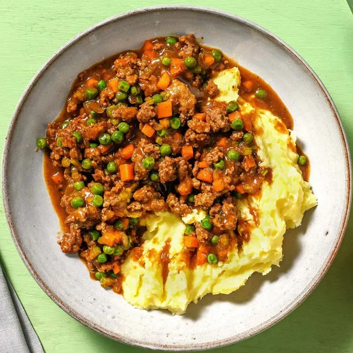 ground lamb, garlic, thyme, potatoes, garlic, salt, onion, carrots, celery, soy sauce, flour, green peas, avocado oil, tomato, sriracha, cilantro, basil