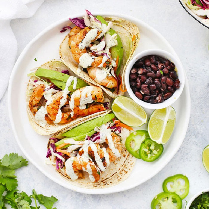 shrimps, cabbage, cilantro, lime juice, honey, salt, pepper, olive oil, chili powder, corn tortillas, salsa, guacamole, Cilantro Lime Ranch Dressing, avocado, black beans, tomato, jalapeno