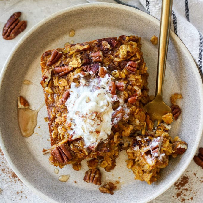rolled oats, pumpkin pie spice, baking powder, pumpkin puree, milk, eggs, maple syrup, vegetable spread, vanilla, pecans