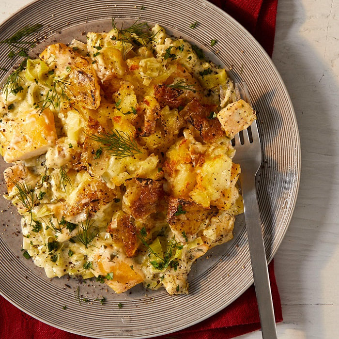 smoked salmon, potatoes, parsley, dill, garlic, leek, cream, salt, pepper, cayenne pepper, Parmesan, eggs, mozzarella