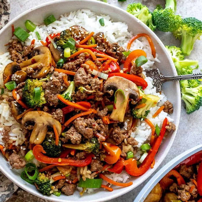ground beef, olive oil, onion, mushrooms, red bell pepper, broccoli, zucchini, carrots, garlic, green onion, soy sauce, brown sugar, rice vinegar, cornstarch, red pepper flakes, sesame seeds, Sriracha, honey, ginger