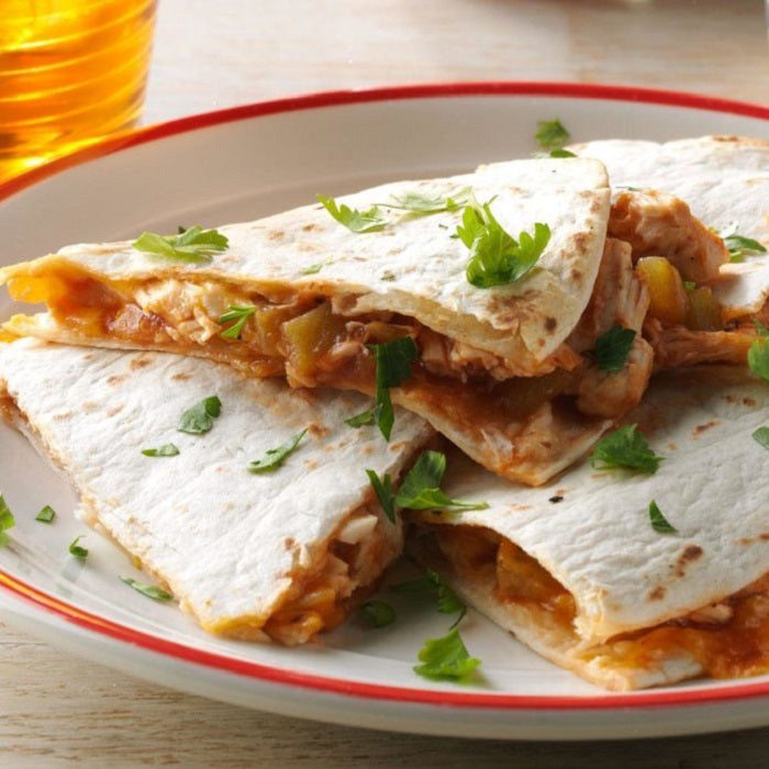 chicken breast, green chilis, salsa, barbecue sauce, taco sauce, flour tortillas, cheddar cheese