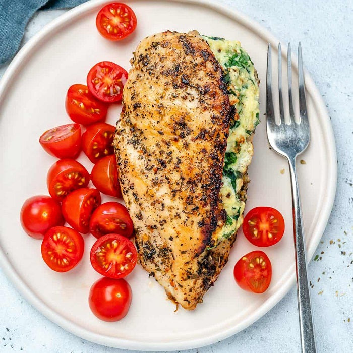 chicken breast, olive oil, Italian Seasoning, red pepper flakes, garlic, onion, salt, ricotta cheese, Mozzarella, Parmesan Cheese, spinach, cherry tomato
