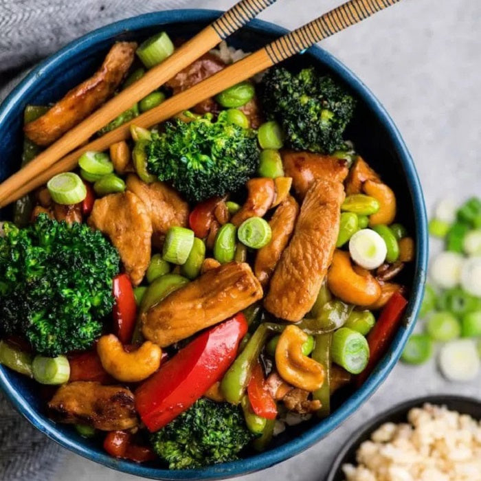 chicken, cashews, soy sauce, honey, hoisin sauce, sesame seeds, peanut oil, garlic, onion, cornstarch, broccoli, red bell pepper, edamame, green onion