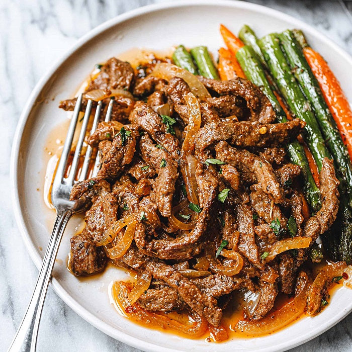 beef, onion, black pepper, paprika, garlic, onion, Italian seasoning, Parmesan, olive oil, red chili pepper, asparagus, carrots, tamari, parsley