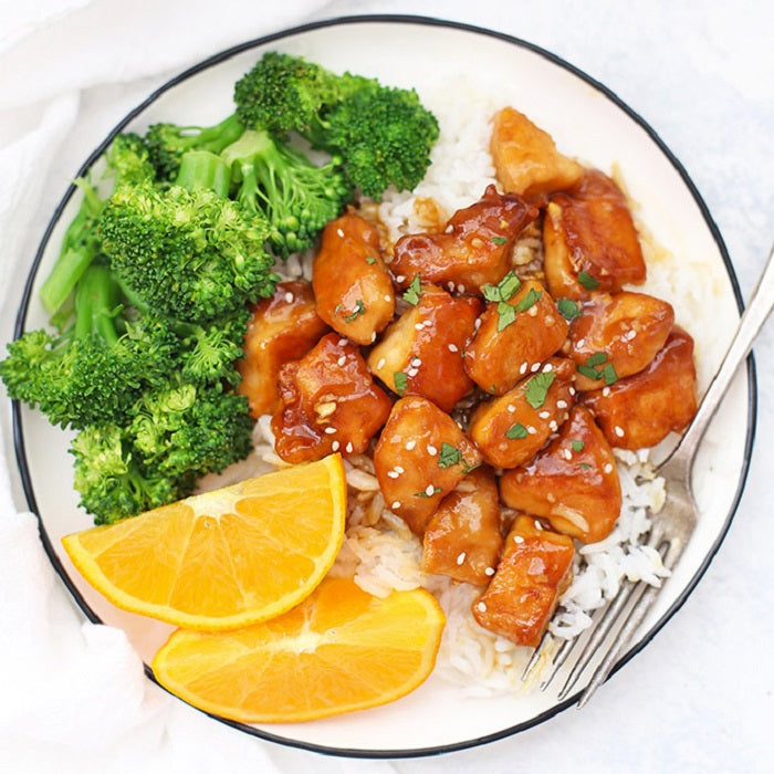 chicken breast, arrowroot, low sodium gluten-free, avocado oil, garlic, ginger, orange juice, rice vinegar, maple syrup, pepper, onion