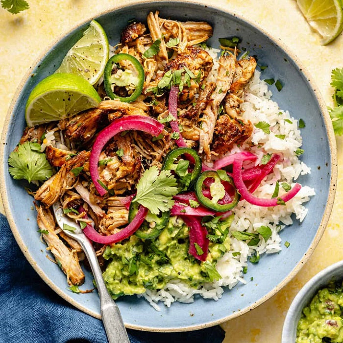 avocado oil, pork, garlic, bay leaves, orange, lime, onion, cumin, oregano, paprika, salt, red pepper flakes, red onion, avocado, jalapeno, cilantro